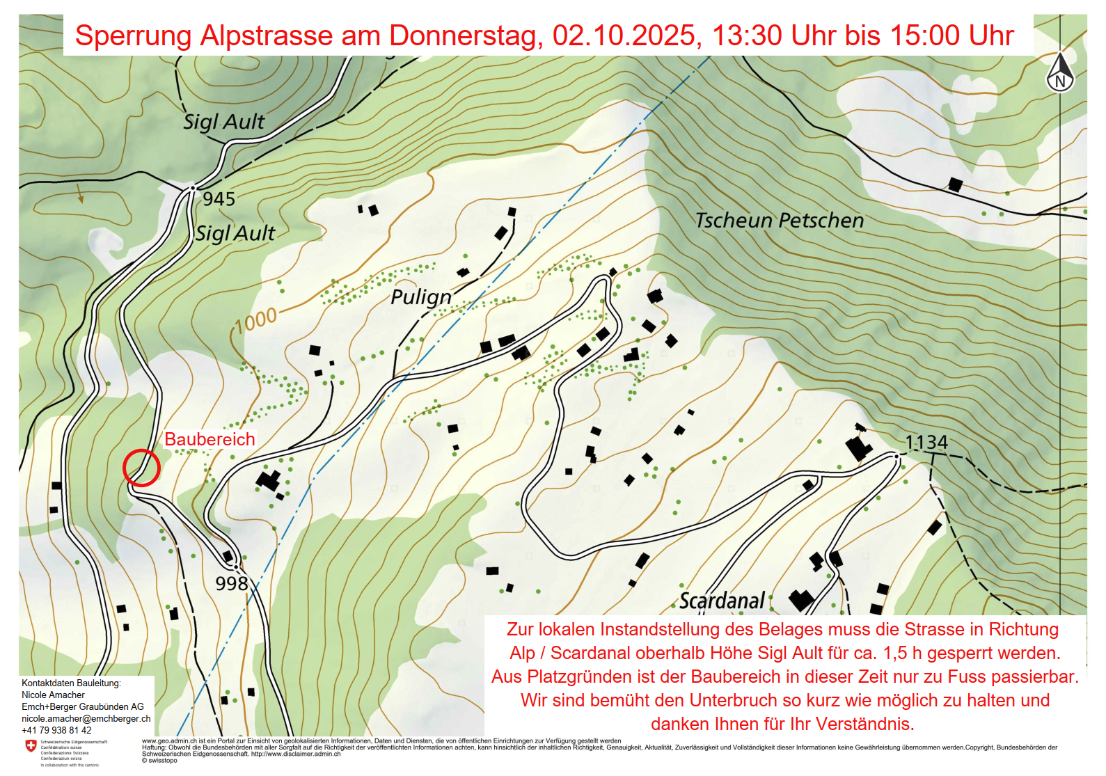 Zur lokalen Instandstellung des Belages muss die Strasse in Richtung Alp / Scardanal oberhalb Höhe Sigl Ault für ca. 1,5 h gesperrt werden.